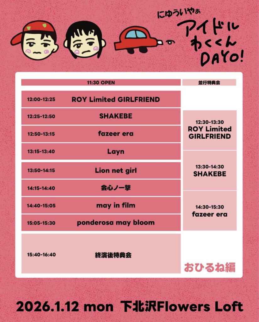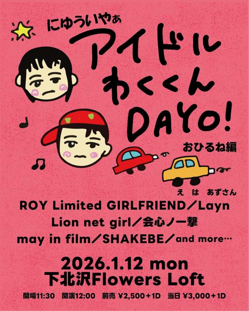 2026/1/12(月祝)に開催いたします、にゆういやぁ アイドルわくくん DAYO!! おひるね編出演についての詳細をお知らせいたします。