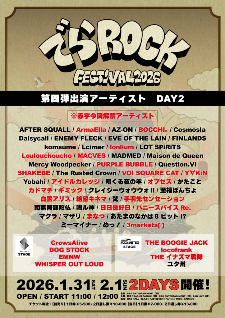 2026/2/1(日) RAD CREATION & RAD ENTERTAINMENT presents でらロックフェスティバル 2026 出演についてのお知らせ